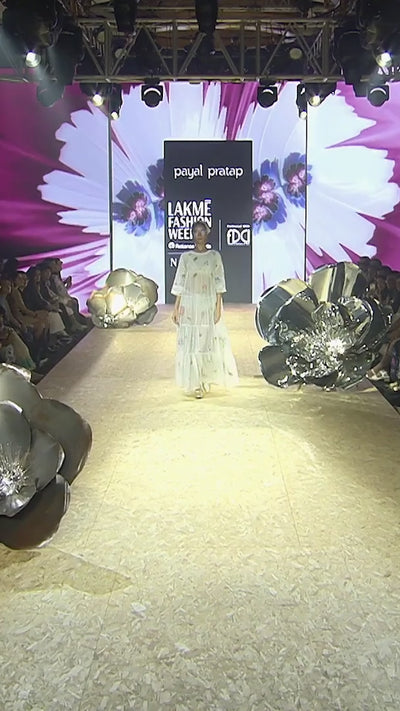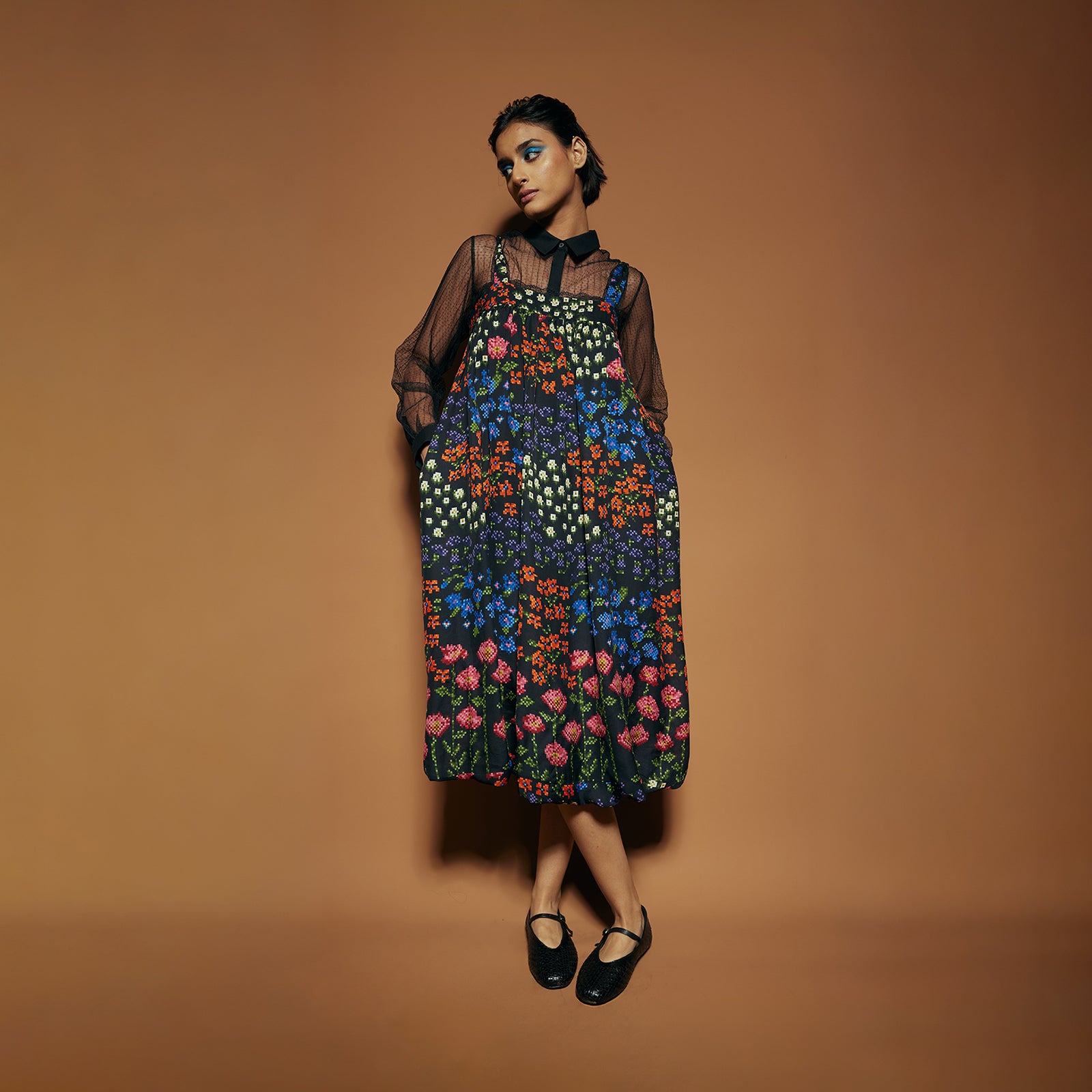 Knee-length dress crafted in handloom cotton, featuring pintuck detailing along the yoke with soft gathers cascading below. Designed with gently flared sleeves, delicate rose appliqué embroidery, and finished with selvedge accents and a loop matar button closure for a subtle statement.
