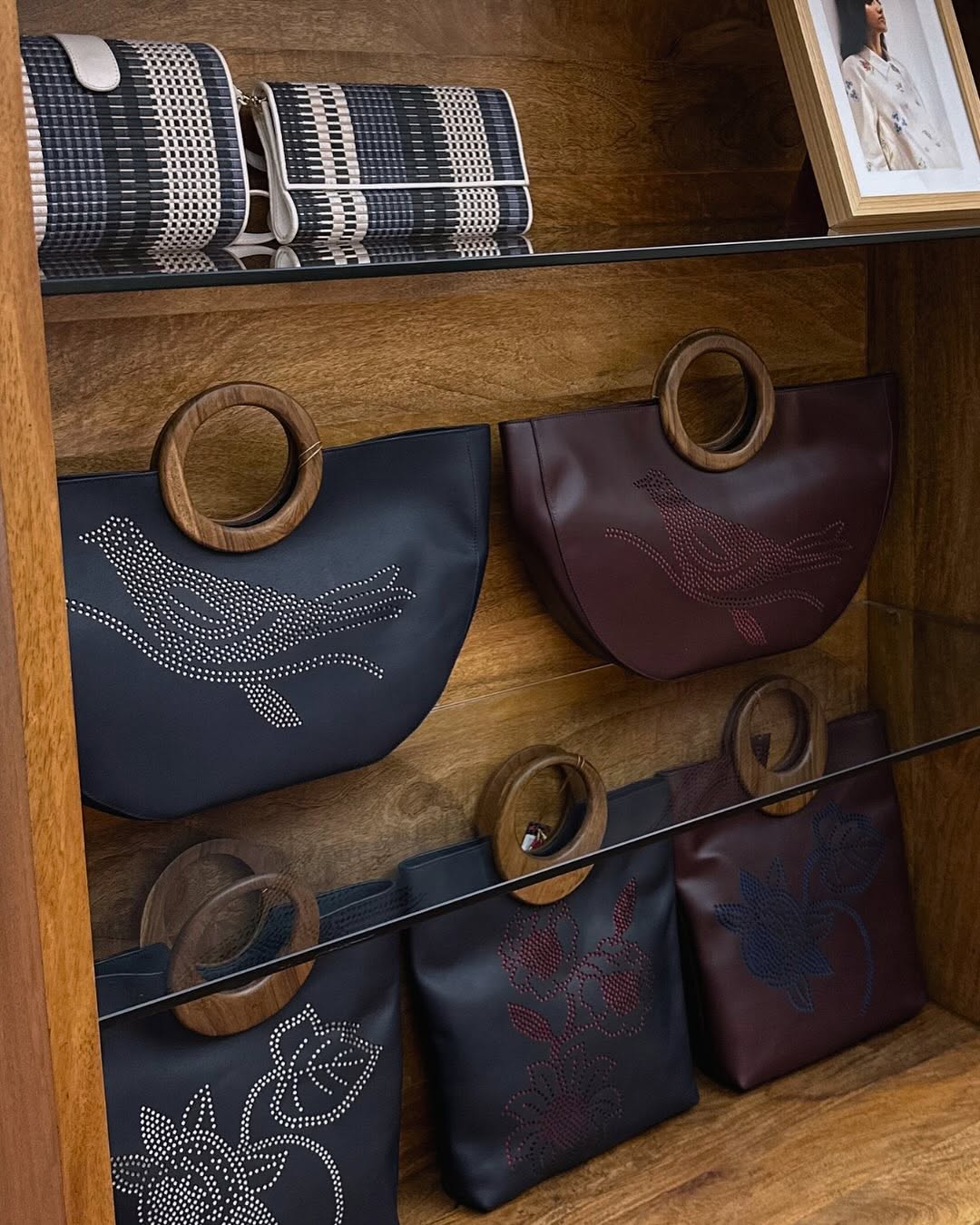 Beyond clothing, her world extends into footwear, bags, and jewellery — handcrafted in brass, silver, glass, and leather — completing each collection like verses in the same poem.